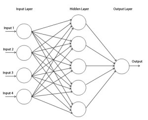 W_{2},W_{1},b_1,b_2 are the parameters of the network and \sigma(x) is called the activation function (There are many such functions are used in neural networks).where x and y can be multi dimensional vectors. The number of dimension in h is also called as number of neurons in the neural network.  Each h can be further mapped to the one/more hidden representation. Since the network has only one hidden representation, it is called as single layer neural network.  It can be graphically represented as below: