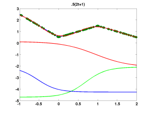 Let us consider little more complicated function where two different line for different interval of x-axis. The function is f(x)=\begin{cases} x+.5 & 0\le x\le\infty\\ -2x+.5 -\infty\le x\le0 \end{cases} and the  graph is shown below. The read curve indicates the function learned by the 2 neuron neural network.  You imagine that the each line is approximated by a single neuron. The neural network can’t approximate the discontinues part of  function and we can observe more error near zero.