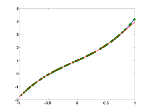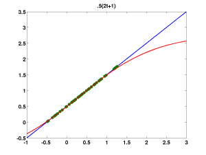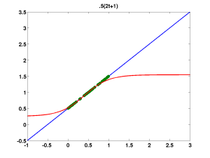 x-axis indicate the input x and y-axis indicates the output y. blue line indicate the underlying function [latex]f=x+.5[/latex], green points indicate the observed data points [latex](x_i,y_i)[/latex] and green curve indicates the approximate function learned by the NN with single neuron.